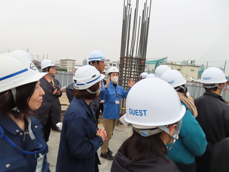 ガス圧接による鉄筋接合についての技術や、鶴見川と矢上川が合流する地点ならではの地盤の弱さがあったことなどについても説明され、普段なかなか目にすることが少ない外壁の内側での工事現場の“リアル”な光景を体感する時間を過ごしました。