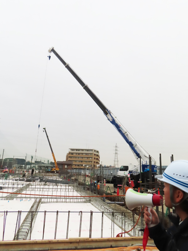 現場では、鉄筋配筋作業をメインに、この日から新たに行われているという柱壁と呼ばれる鉄筋の配筋圧接の作業を見学。