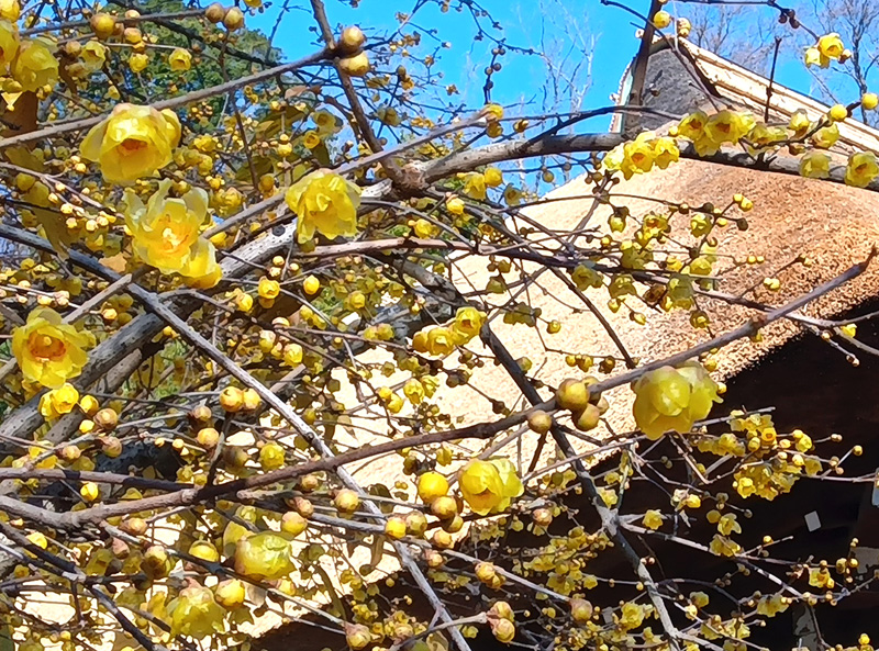 西方寺の蝋梅(ろうばい)、同寺は源頼朝の時代に鎌倉で建てられ、その後この新羽の地に移ってきた。花の名所というだけでなく、数多くの文化財を所蔵していることでも知られる(港北ボランティアガイドの会提供)