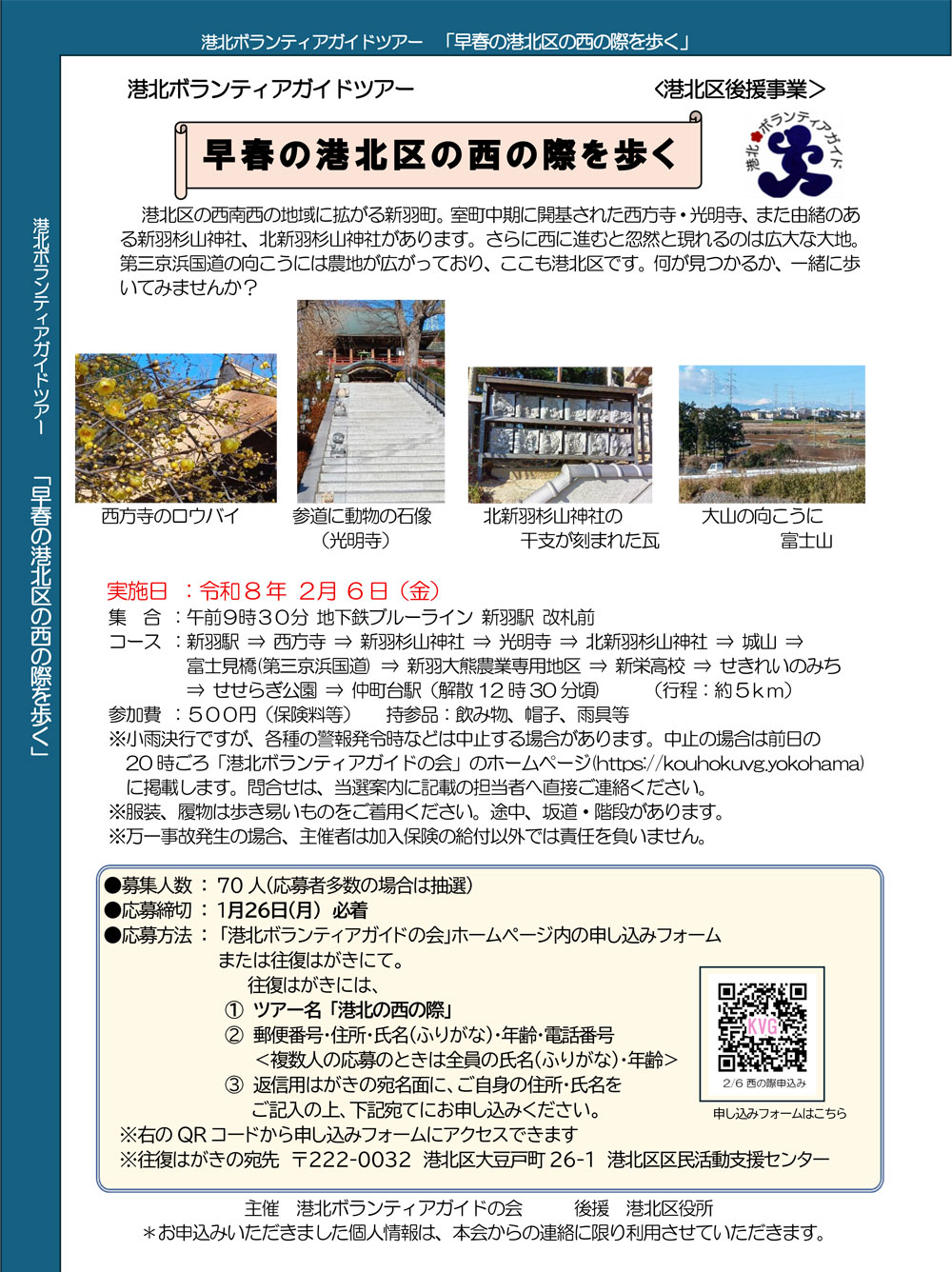 2026年2月6日(金)に企画されたウォーキングツアー「早春の港北区の西の際を歩く」の案内チラシ(港北ボランティアガイドの会提供)