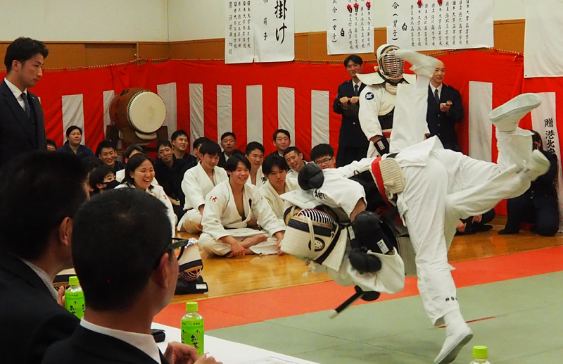 港北警察署の新年恒例「武道始式」に地元高校生が初登場、現役警官に柔剣道で挑み、手に汗握る熱戦を展開しました。