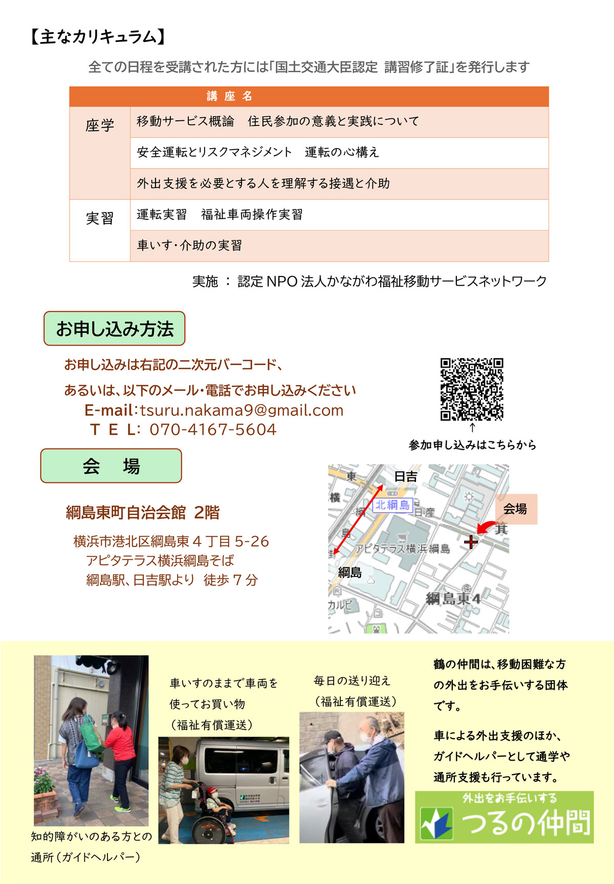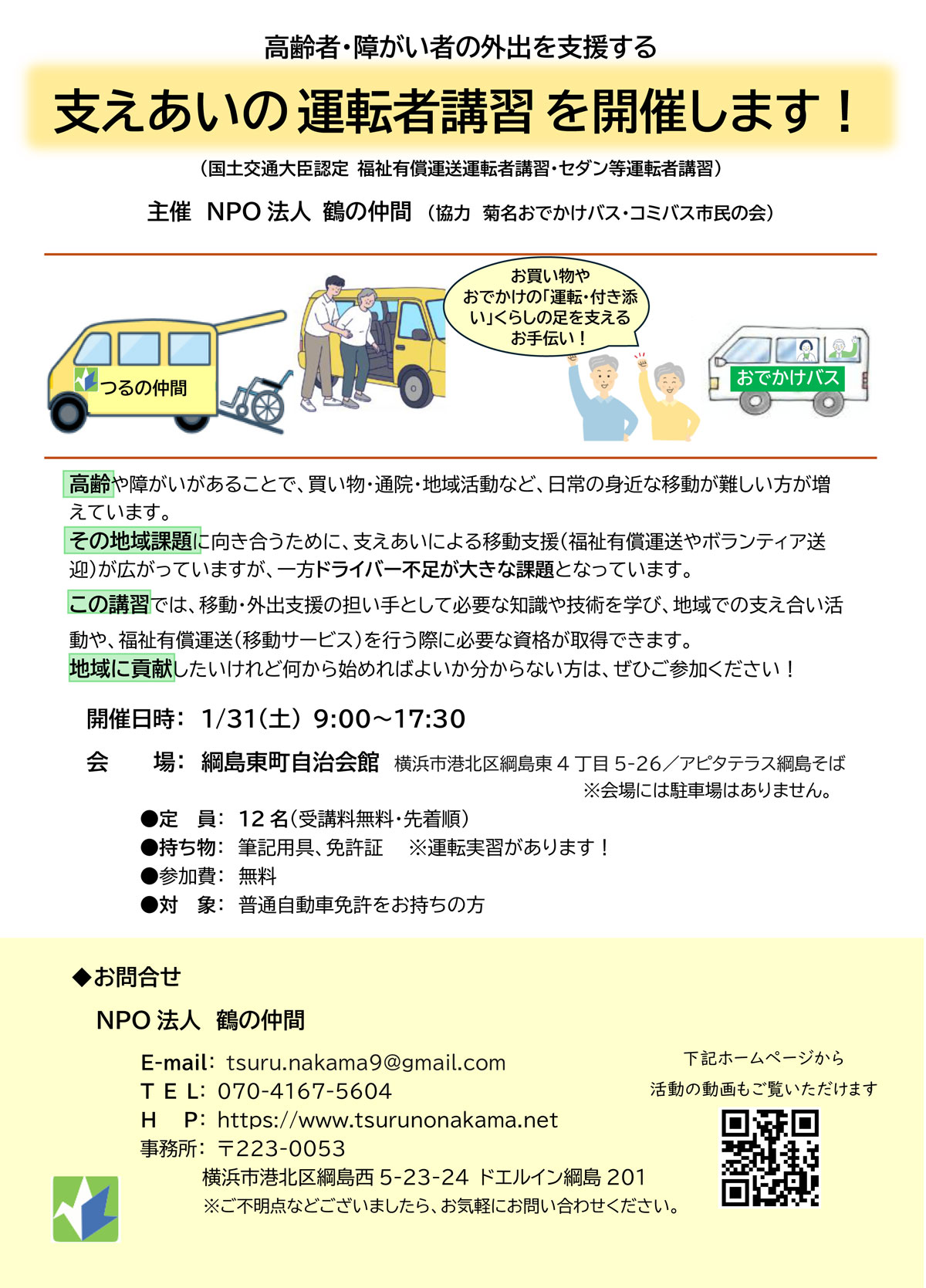 綱島東4丁目に本部を置き、南日吉保育園近くの綱島西5丁目に事務局を持つNPO法人「鶴の仲間」(吉原修理事長)は、高齢者や障がいのある人外出を支援する担い手を養成する「支えあいの運転者講習」を今月(2026年)1月31日(土)に綱島東町自治会館(綱島東4)で開きます。