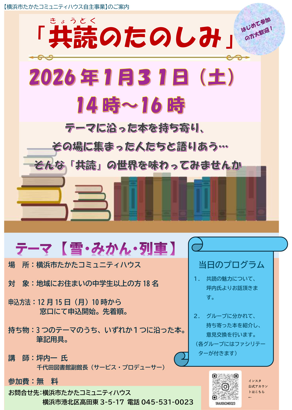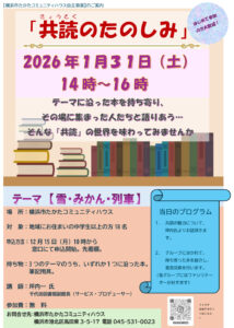 地下鉄グリーンライン・高田駅から徒歩約5分の高田東3丁目に位置する「横浜市たかたコミュニティハウス(高田コミハ)」では、今週(2026年)1月31日(土)14時から16時まで、テーマごとに読んだ本を参加者間で語り合う「共読(きょうどく)」のワークショップを開きます。