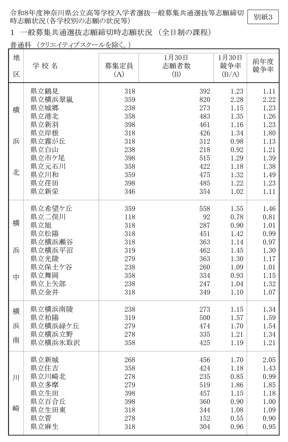 (※)横浜北地区(鶴見・神奈川・港北・緑・青葉・都筑)に位置する県立高校のなかで、クリエイティブスクールの県立青葉総合(田奈高校の施設を活用し新規開校予定、青葉区桂台)、複数の学科で募集する県立神奈川工業(全日制・定時制)(神奈川区平川町)と県立神奈川総合(神奈川区平川町)、また県立横浜翠嵐(定時制)における競争倍率は県の発表資料[PDF]で直接ご確認ください