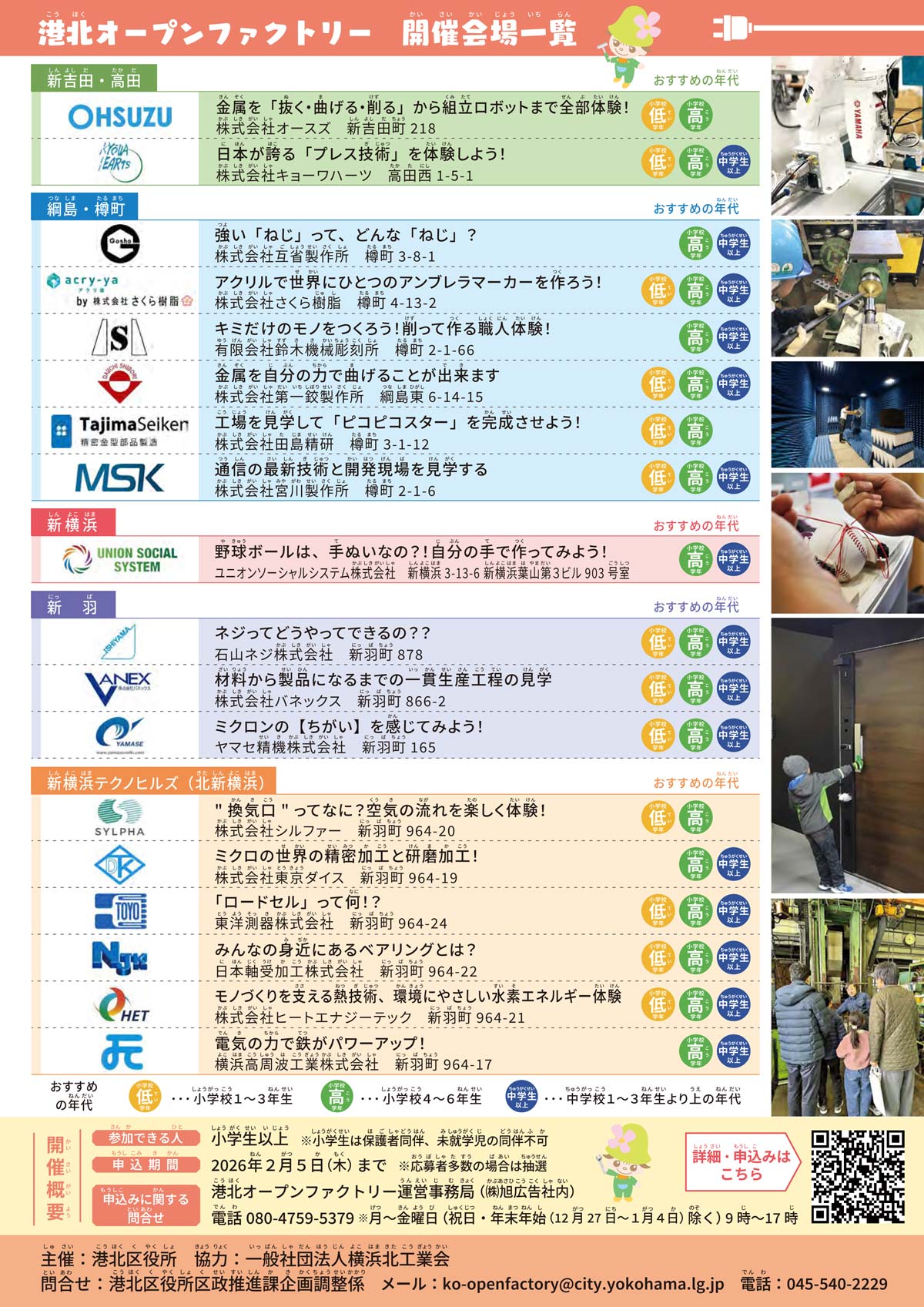 港北区は再来月(2026年)3月7日(土)に工場見学・体験イベント「港北オープンファクトリー」を開催するにあたり、来週2月5日(木)まで小学生以上の参加者計545人を募集しています。
