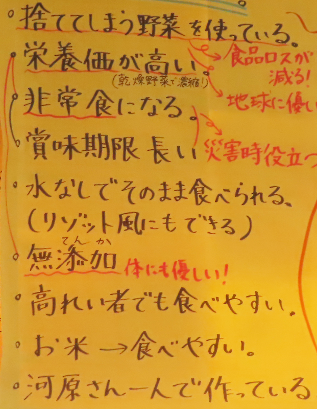 大きなテーマにも掲げていた「食品ロス解消」のためにと、地元・師岡町の生産者からの協力を得て、小松菜などの野菜も仕入れ、乾燥させたものを入れることでの地産地消、また栄養バランスへの配慮も行っています。