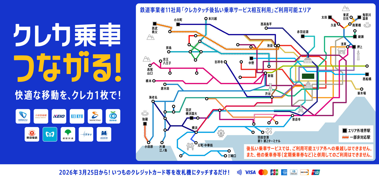・「2026年3月25日(水)から、関東の鉄道事業者11社局の路線を対象とした、クレジットカード等のタッチ決済による後払い乗車サービスの相互利用を開始します」(東急電鉄など11社局などの共同発表)