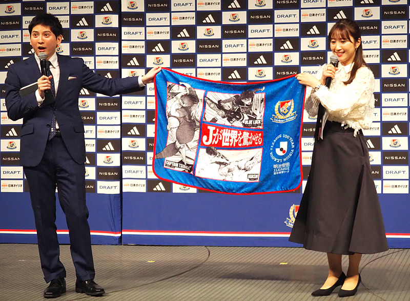 2月6日(金)の開幕戦では先着3万人に横浜F・マリノスバージョンの「熱狂開幕ブランケット」がプレゼントされる。写真は1月10日の新体制発表会でtvkの番組「キックオフF・マリノス」のMC・小山愛梨さんと、横浜出身でF・マリノスのサポーターとしても知られるアナウンサー・西川憲孝さん