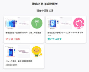 区内3カ所に設けられる期日前投票所の混雑状況はリアルタイムで発信中(VACANによる「港北区期日前投票所 現在の混雑状況」より)