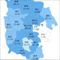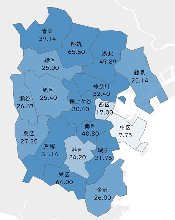 18区別に見ると、9区で30人を超えており都筑区(65.60)や栄区(64.00)が特に高く、港北区(49.89)や南区(40.80)、青葉区(39.14)が続いており、都筑、港北、青葉の北部3区の高さが目立ちます。