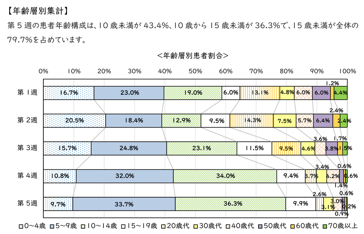 年齢別では15歳未満の報告が全体の79.7%を占めているといい、市内143施設(保育所・幼稚園2、小学校83、中学校41、高等学校13、その他4)から、3513人の患者数の報告があったといいます。