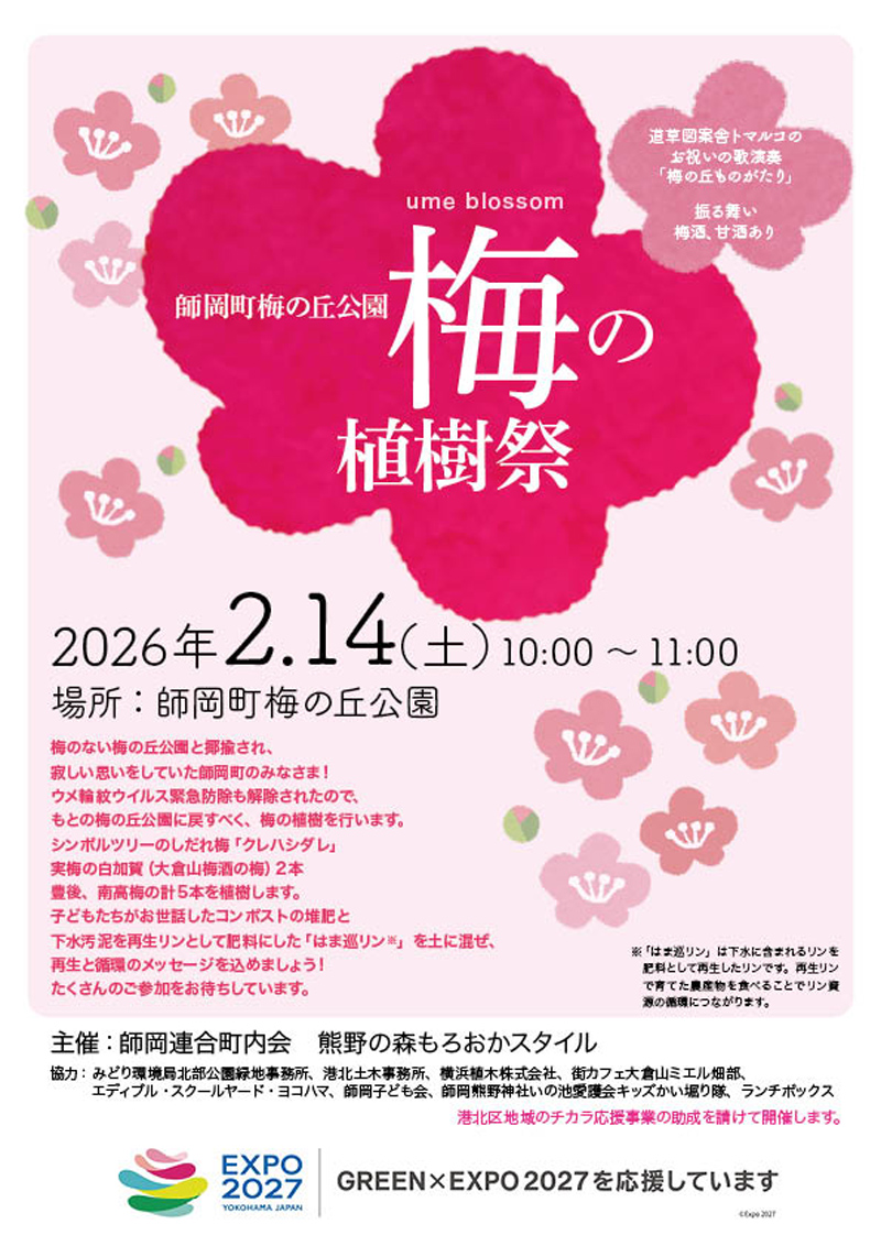 当日は、横浜市を拠点に活動を行っているというアートユニット・道草図案舎トマルコによる祝いの歌「梅の丘ものがたり」の披露や、梅酒や甘酒の「振る舞い」も予定されているとのことです。