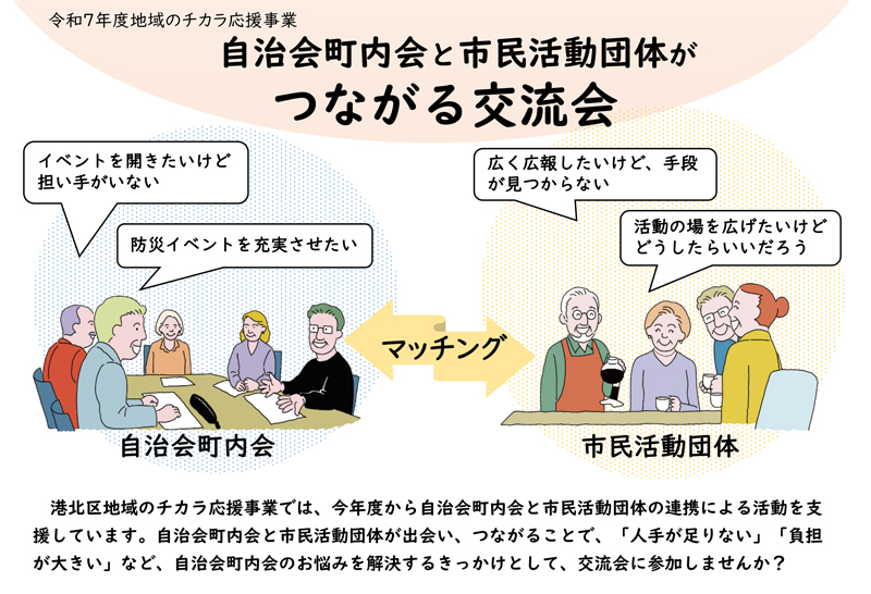 市民活動団体が自治会町内会と連携して実施する、地域の課題解決や港北区の魅力を高める事業に対して補助金を交付する「地域のチカラ応援事業」連携コースの事業として行われる(連携を促す交流会の案内、港北区サイト)