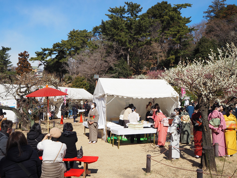ステージ近くの特設ブースでは大倉山観梅会の名物となっている「野点(のだて=屋外茶会)」(抹茶・菓子付き参加費500円、各日10:30~12:30、13:00~15:00)が今年も企画されています。