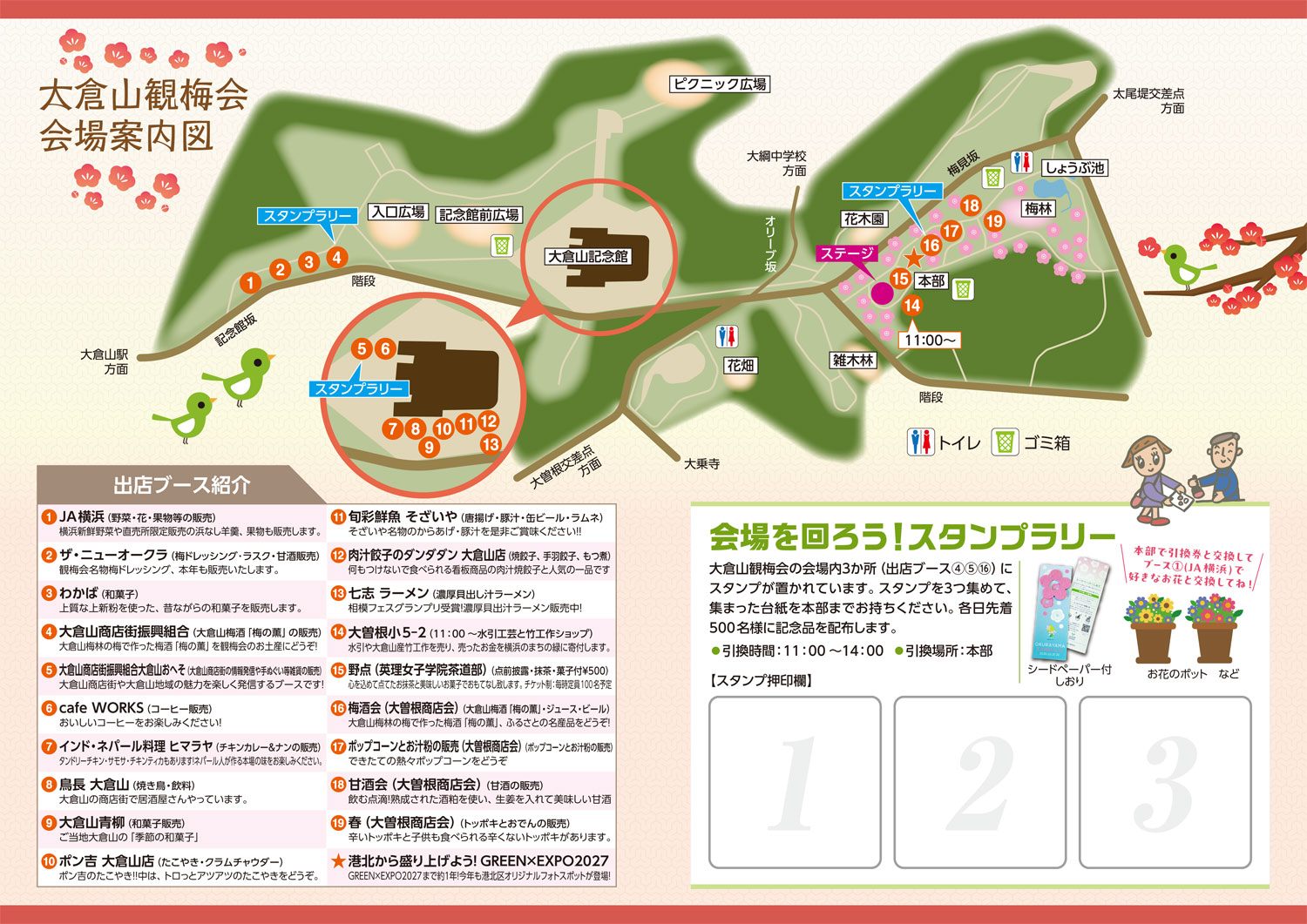 第38回となる今回も大倉山駅から急な坂道をのぼった先にある「大倉山記念館」の周辺から、その奥に位置する「梅園」の付近にかけてが会場。大倉山商店街や大曽根商店会などによる飲食物を中心とした販売ブースが並び、梅林エリアにはステージが設けられます。