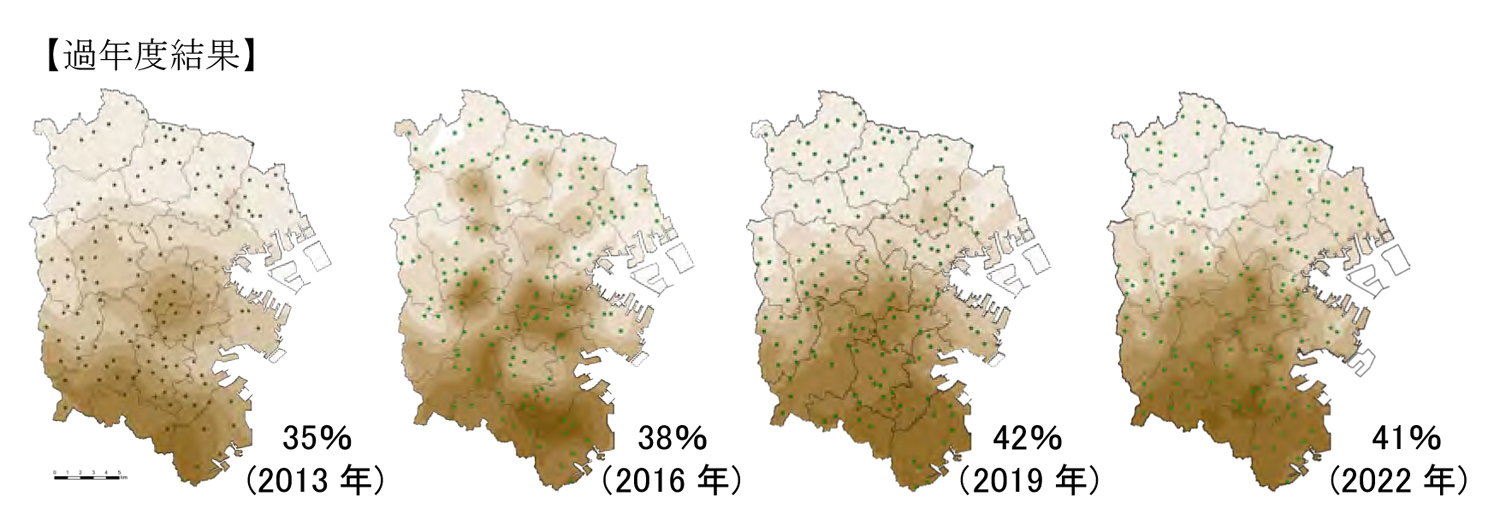 2013(平成25)年からの経過を見ると、これまでは市の南部で目撃が目立っていたものが、年を経るごとに北部へも浸透。市内全体の確認率も2013年調査で35%だったのが、2025年は51%まで上昇していました。