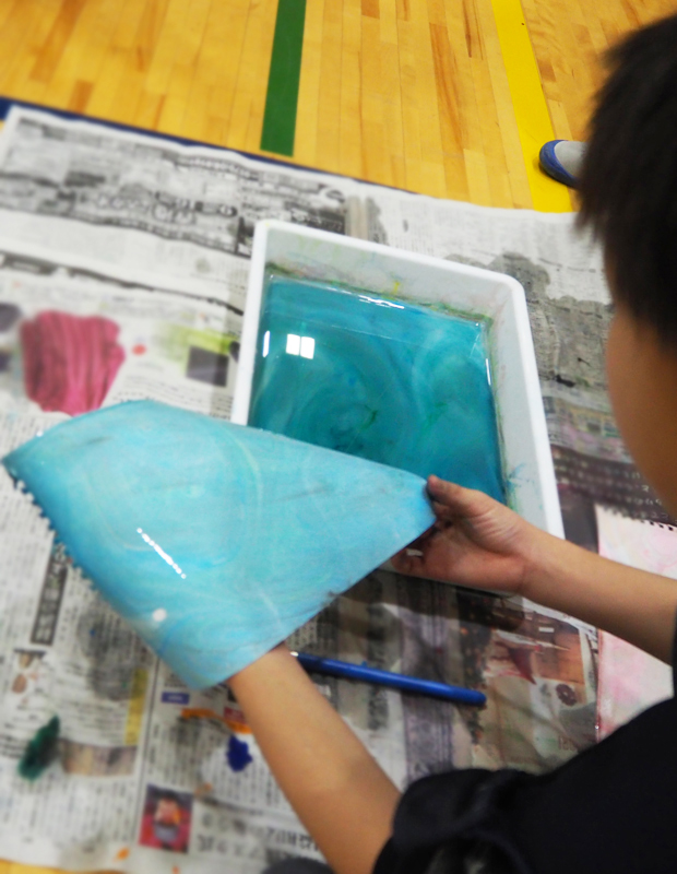 3クラス約90人ずつの2回に分けて授業を実施するスタイルで、西洋では15世紀から続くという伝統的な技法の「マーブリング」に初挑戦しました。