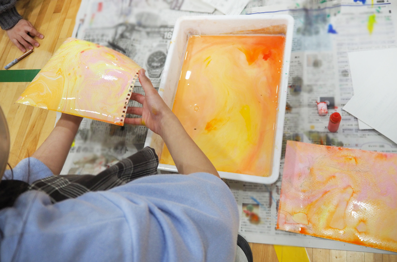 水などの液体に落とした絵の具が模様を生み出し、そこに紙を浸して絵柄を写し取る「マーブリング」を初体験した子どもたちの多くから、「予想できない」絵柄の作品が生み出される瞬間に大きな歓声が上がります。