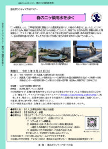 港北ボランティアガイドの会では「水をめぐる歴史や文化を偲びつつ、桜やさまざまな花が咲き始める春の気配を楽しむツアーです。多くの皆さんの参加をお待ちしています」と呼びかけています。