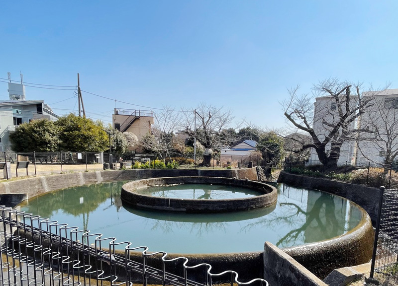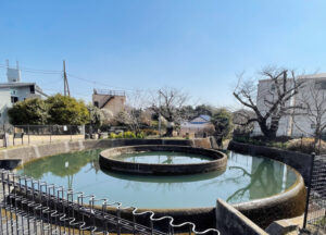 最初の見どころが国の登録有形文化財となっている「久地円筒分水(くじえんとうぶんすい)」です。二ヶ領用水が農業用水として活用されていたころ、周辺の複数の地域に公平に水を分配するための施設で、上下流の水面の高低差を利用した水分配の仕掛けに加え、付近の桜にも注目したいところ。