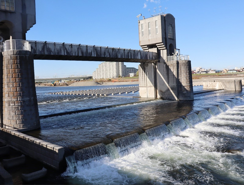 宿河原の堰は、多摩川の水を堰(せ)き止めて水面を高くすることで、すぐ上流にある二ヶ領用水の水取り入れ口に水を引き込むようにする仕掛けとなっています。