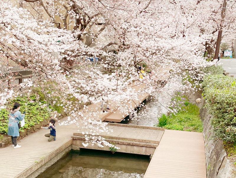 続いて南武線・久地駅近くまで歩き、水の流れが出会う場所にある「出合い橋」を過ぎると、桜並木が続くスポット。多摩川から二ヶ領用水へ水を取り入れる堰(せき)の一つ「宿河原の堰」まで桜を眺めながら歩きます。