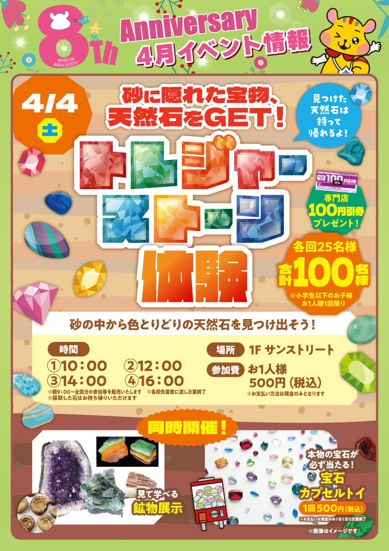 ・4月4日(土)10:00/12:00/14:00/16:00(4回)「トレジャーストーン体験」(1階「サンストリート」、小学生以下対象、参加費1人500円)