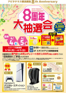 アピタテラスの8周年企画では、あす4月4日(土)と5日(日)の2日間は「8周年大抽選会」を実施。今週3月30日(月)以降の専門店レシートを対象に2000円以上で1回参加でき、1人最大で5回まで、両日とも9時から先着3000回転まで行われます。