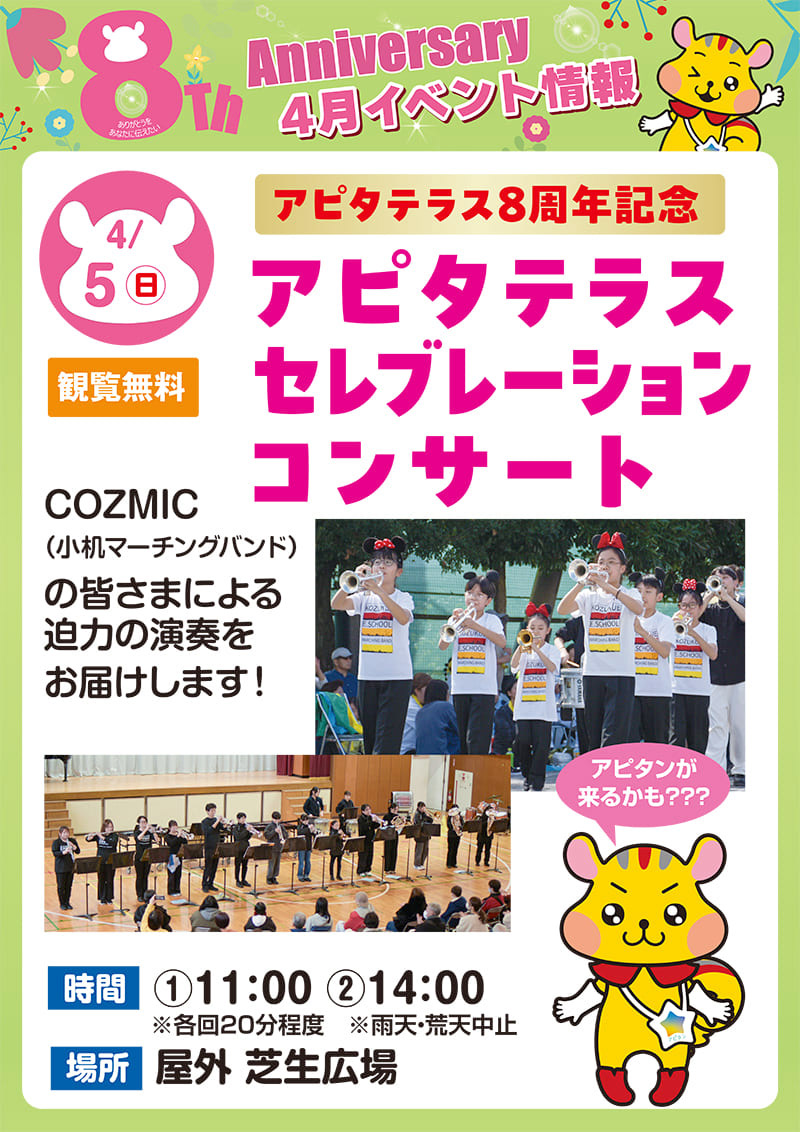 ・4月5日(日)11:00/14:00(2回)「アピタテラス セレブレーション コンサート」(屋外「芝生広場」、COZMIC=小机マーチングバンド出演)