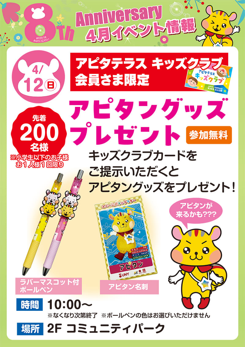 ・4月12日(日)10:00~「アピタングッズプレゼント(アピタテラスキッズクラブ会員向け)」(2階「コミュニティパーク」で先着200人、※キッズクラブの詳細はこちらのPDF案内参照)