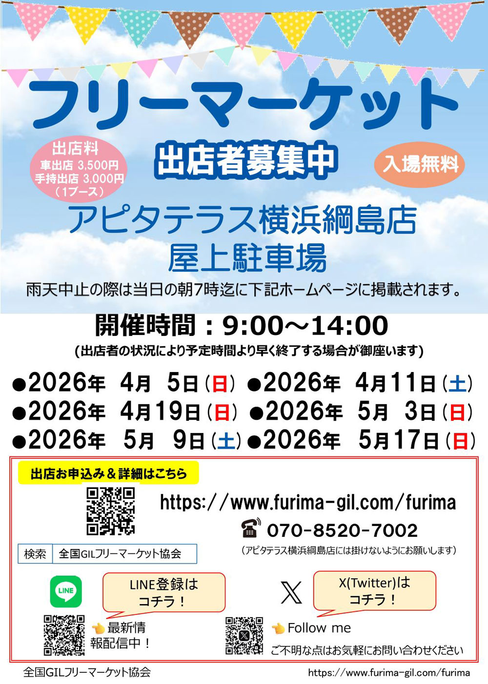 ・4月5日(日)・11日(土)・19日(日)ほか9:00~14:00「アピタテラス横浜綱島 屋上フリーマーケット」(屋上駐車場、雨天時は中止)