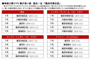 港北区は前年に続いて総合1位となり、賃貸のタイプ別では「カップルタイプ」での支持が高く、アットホームは「高い交通利便性に加え、オフィス街としての機能と落ち着いた住環境が共存している点が評価されたようです」と分析しています。