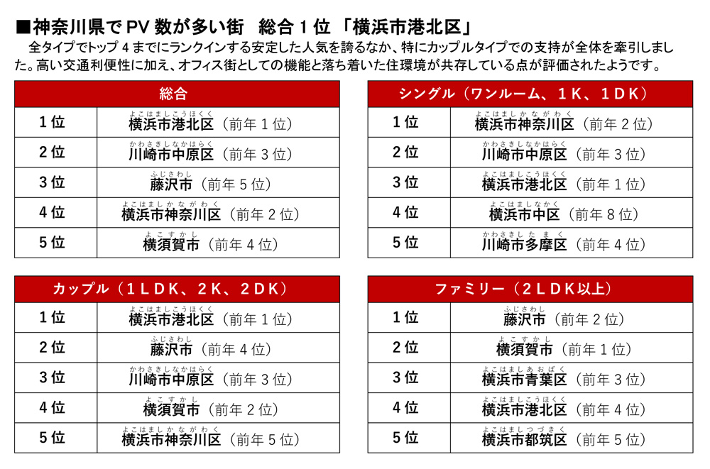 港北区は前年に続いて総合1位となり、賃貸のタイプ別では「カップルタイプ」での支持が高く、アットホームは「高い交通利便性に加え、オフィス街としての機能と落ち着いた住環境が共存している点が評価されたようです」と分析しています。