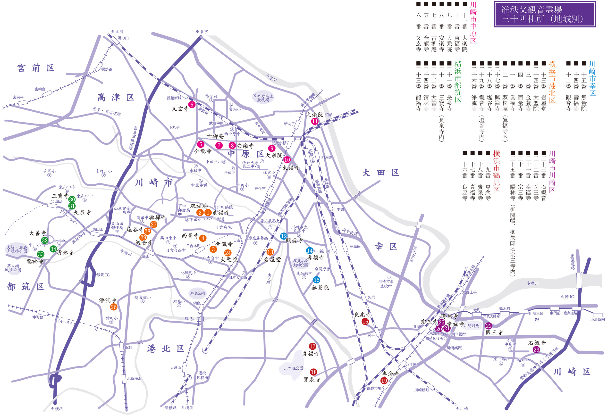 札所は2市5区(行政区)に分かれていますが、戦前まで存在した行政区画「橘樹(たちばな)郡」の範囲内が目立ち、日吉や高田、新吉田町、鶴見区、都筑区の北山田や南山田、大棚(おおだな)、川崎市内では中原区や、“川崎日吉”地区のある幸区など横浜・川崎の両市に近いエリアに広がっています。